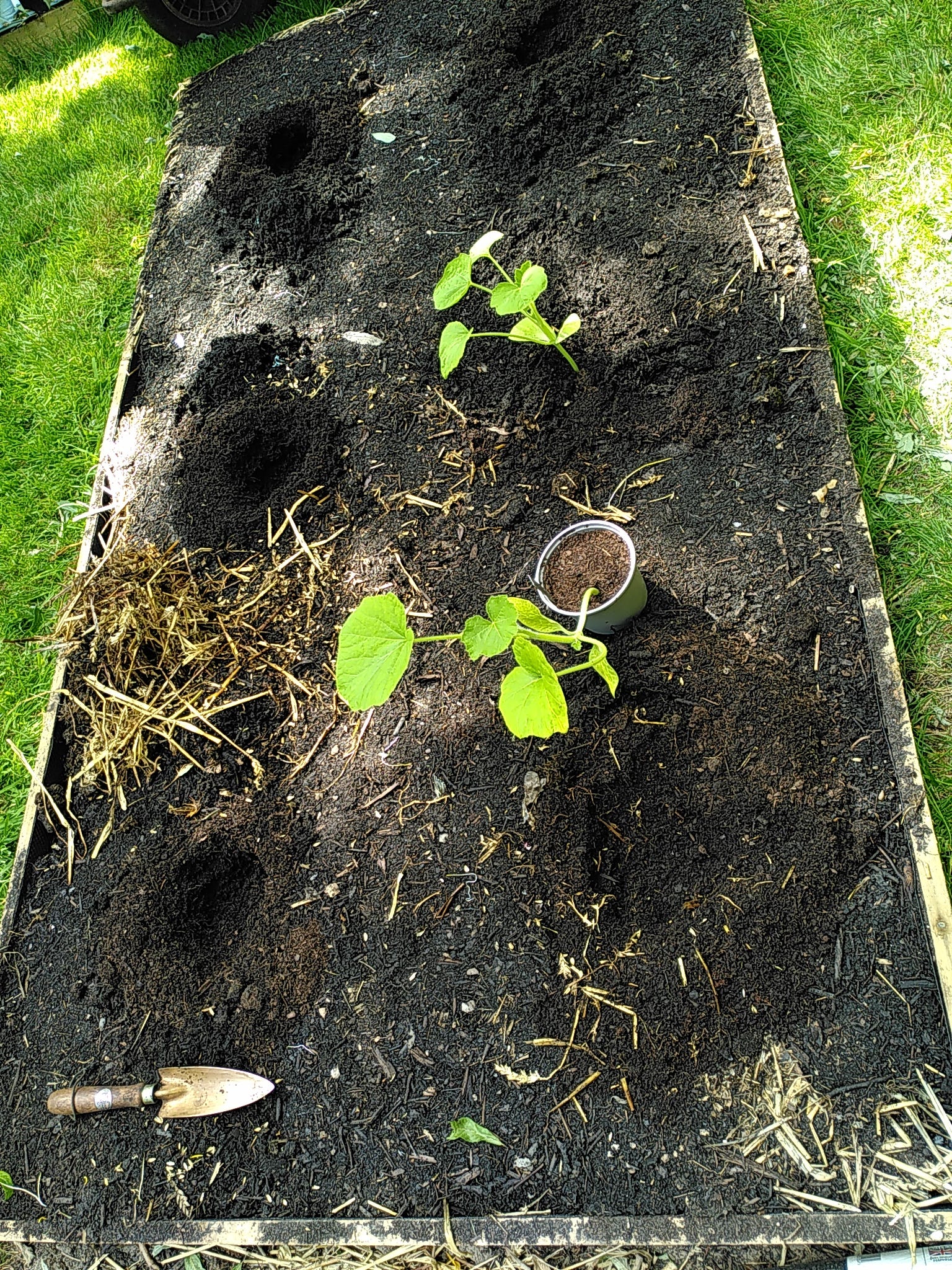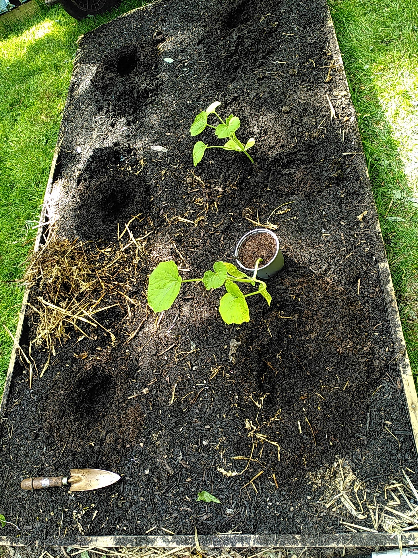 So I set about preparing planting holes for the first set of squashes. I’d been more than a bit concerned about the potential difficulty of doing that, because straw is notoriously hard to cut.