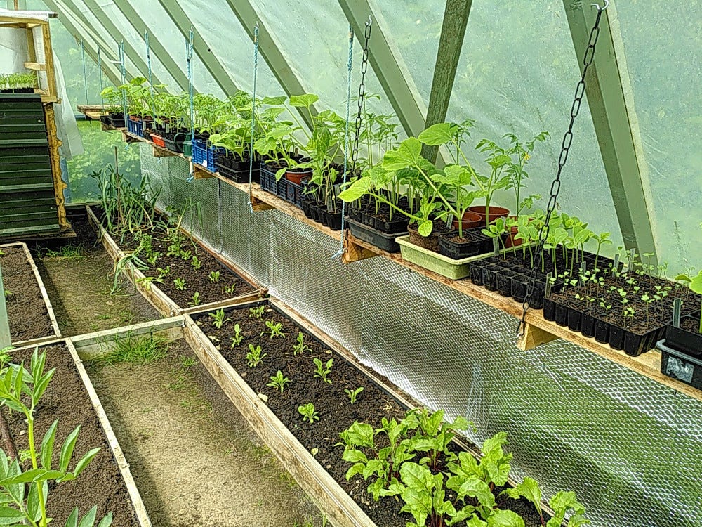 So we kept holding back, on planting out the heat-loving squashes, melons, beans, chilis, cucumbers and tomatoes—instead potting and re-potting them again and again, (and then yet again!) so they could grow on within the cozy safety of the polyhouse.